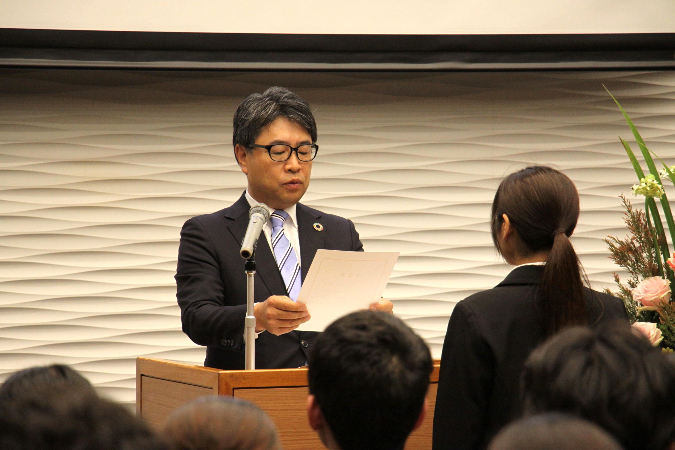 (写真は、北海道銀行内定式で、内定者に内定書を手渡す兼間祐二頭取)
