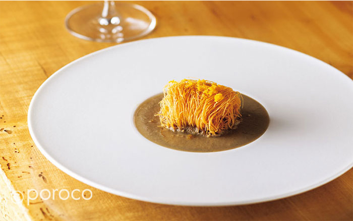 店内は木のぬくもりに包まれた落ち着きある雰囲気。ここで、クラシックなフレンチを基調にした繊細さと緩急織り交ぜたコースが展開されます。今月のひと皿「ホタテのカダイフ巻きゴボウのソース」は、軽く火入れしたホタテを香ばしいカダイフで包み、ゴボウのソースで奥行きをプラス。
