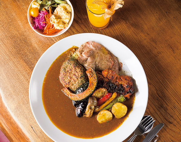 野菜が採れない冬には、越冬ジャガイモやサツマイモ、保存食品を作るなどして工夫をしているそう。ハンバーグにタンドリーチキン、ローストポーク、カレー、焼き野菜、燻製米ピラフがのった「欲張りプレート」1,936円、16:00まではサラダ付き。「ほおずきソーダ」756円。「フルーツほおずきのチーズケーキセット」880円。コーヒーは、ウガンダの無農薬・防腐剤不使用の豆を丁