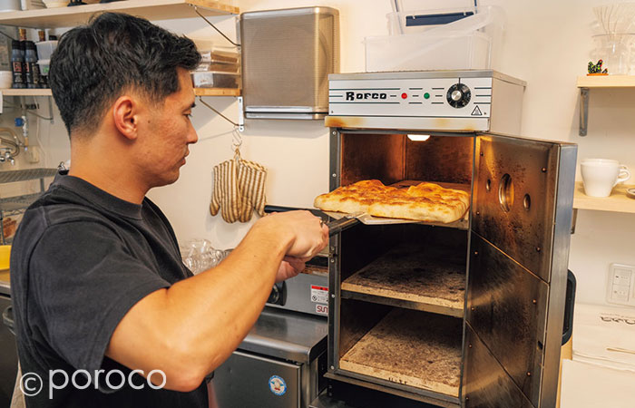 売切れ次第終了なので早めの訪問がオススメ。外はカリッと中はモチモチのフォカッチャサンド「モルタデッラソーセージ&ピスタチオペスト」1,100円、「カフェラテ」650円。カンパーニュのトーストサンドイッチより「ビーフ&ピクルス」シンプルで開放的な店内。夏季は入口横にテラス席も登場。店内にある小型のオーブンを朝からフル稼働し、フォカッチャやカンパーニュを焼き上げる。濃い目の味つけのサンドイッチはクラフトビールとも相性抜群! ノボルブルワリーをはじめ大森さ