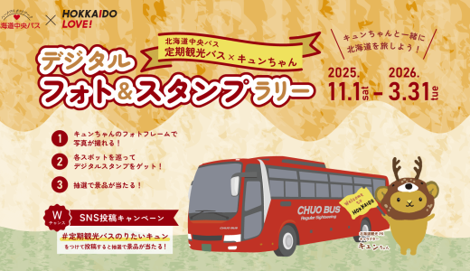 北海道中央バスでは2025年11月1日(土)から2026年3月31日(火)まで、デジタルスタンプラリーイベント『定期観光バス×キュンちゃん デジタルフォト&スタンプラリー』を開催します!