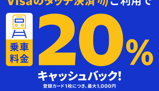 本キャンペーンはVisaのキャンペーン専用登録ページ(以下、「Visa割」)にカード番号を登録の上、キャンペーン期間中に上記の対象事業者で「Visa割」に登録済のVisaカードをタッチ決済にて利用すると、20%キャッシュバックされます。