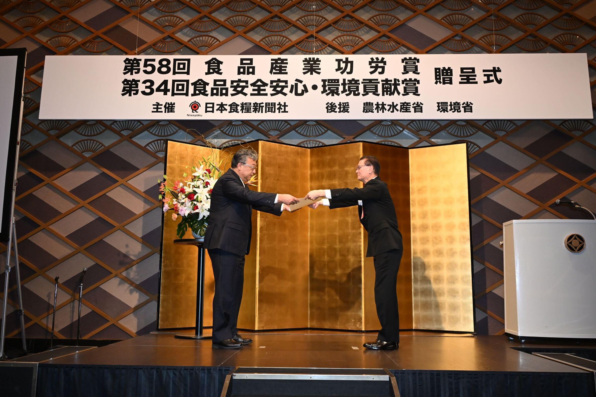 コープさっぽろ(本部・札幌市西区)の大見英明理事長が、2025年度「食品産業功労賞」(主催・日本食糧新聞社、後援・農林水産省、環境省)の流通・情報部門で受賞した。2025年11月4日に贈呈式が行われた。(写真は、第58回食品産業功労賞の流通・情報部門贈呈式。左が大見英明氏=コープさっぽろ提供)