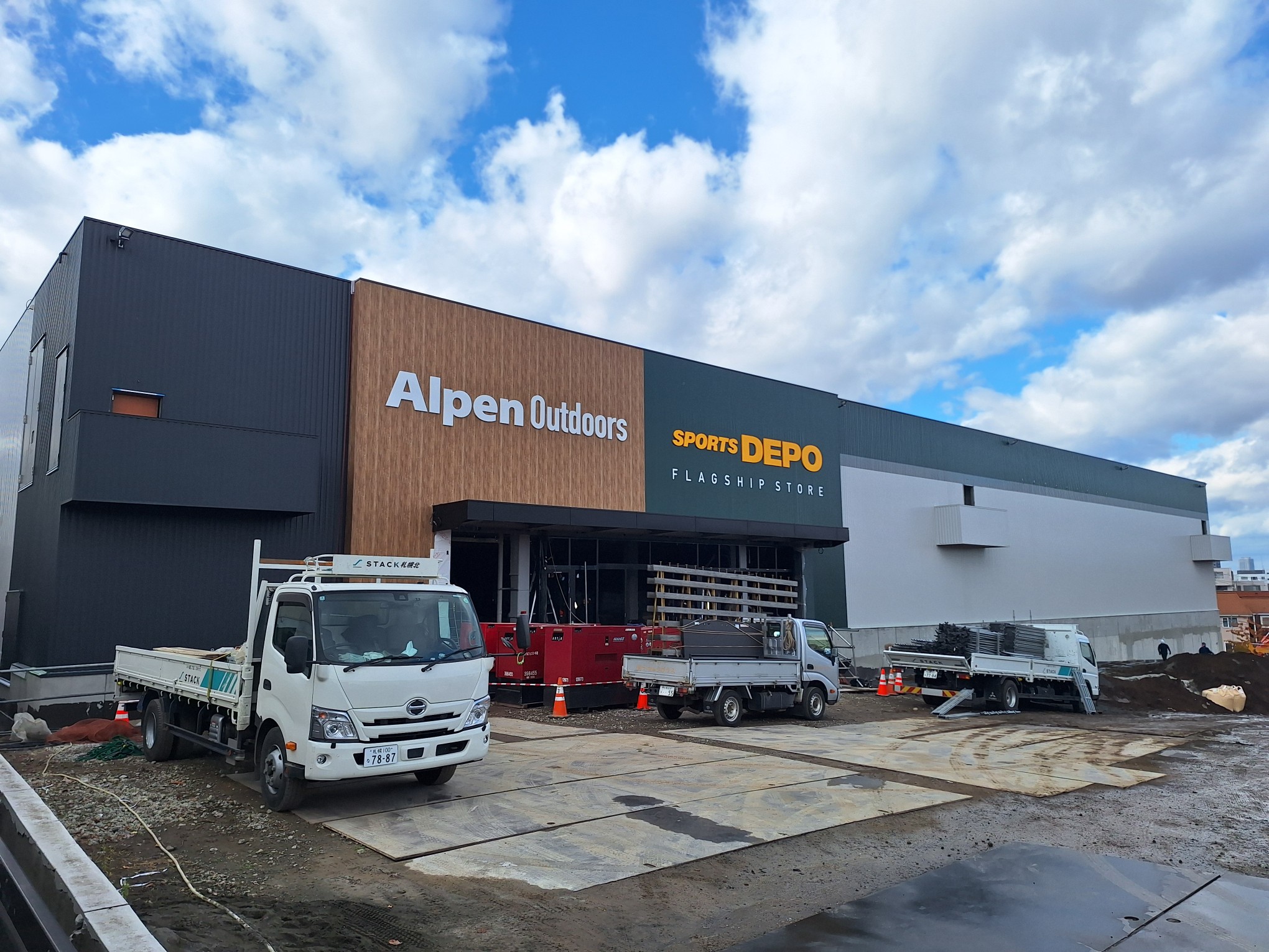 アルペン(本社・名古屋市中区)は、札幌豊平区月寒中央通2丁目に「アルペンアウトドアーズ・スポーツデポフラッグシップストア」の2ブラント複合店舗を出店する。オープン時期は未定だが、アルペンの決算期である2026年6月期中にオープンとなりそう。(写真は、札幌豊平区月寒中央通2丁目で建設中の「アルペンアウトドアーズ・スポーツデポフラッグシップストア」の2ブラント複合店)