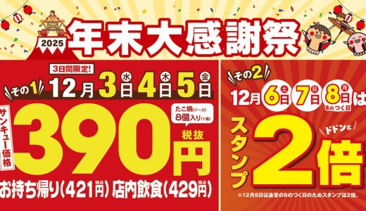 築地銀だこは2025年12月3日(水)〜8日(月)の6日間、全国の築地銀だこ店舗(一部店舗を除く)にて、1年間の感謝を込めた『年末大感謝祭』を開催します!