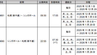 札幌イベント シンガポール航空「札幌(新千歳) – シンガポール」間の季節定期直行便を運航! SNSのフォローもお願いします!⇒ X ⇒ Instagram ⇒ Threads シンガポール航空は2025年11月30日から2026年1月29日までの期間限定で札幌(新千歳) – シンガポール間の季節定期直行便を運航します!... 2025.10.14 札幌イベント