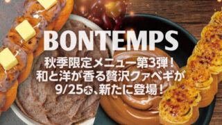 札幌イベント 北区にもある韓国式ねじりドーナツのお店「BONTEMPS(ボンタン)」から和と洋が香る贅沢クァベギ『アンバターソルティ』・『キャラメリゼ ヴァニーユ』が9月25日(木)より発売! SNSのフォローもお願いします!⇒ X ⇒ Instagram ⇒ Threads 北区にもある韓国式ねじりドーナツ(クァベギ)の人気店「BONTEMPS(ボンタン)」にて、秋の季節限定メニュー第3弾『アンバターソルティ』・『キ... 2025.09.19 札幌イベント